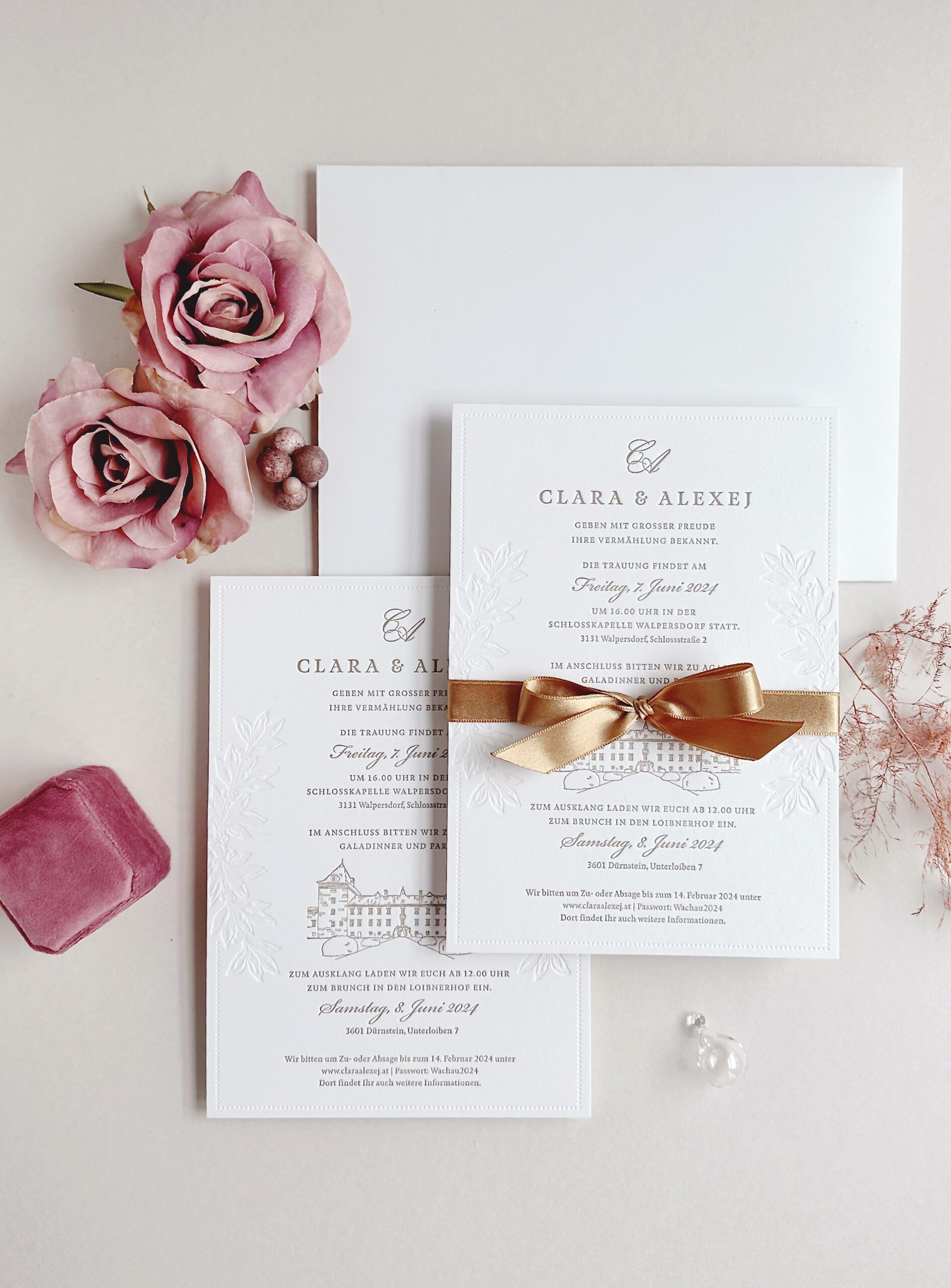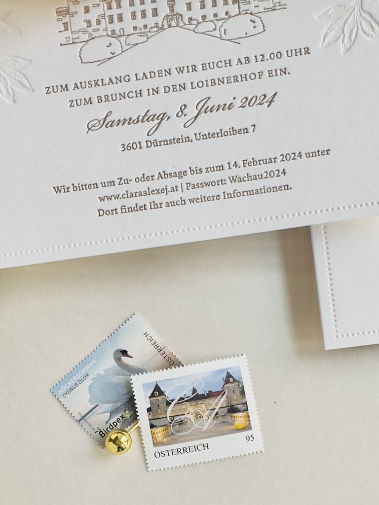 Die Einladungskarten werden mit zusätzlichen, fein abgestimmten Gestaltungselementen ergänzt. Etwa zarten floralen Blindprägungen, die die Struktur des Baumwollpapiers betonen, elegant platzierten Ornamentrahmen oder einer farblich abgestimmten Adressdruck auf dem Umschlag. Auch personalisierte Monogramme, feine Illustrationen botanischer Motive oder elegante Farbschnitte können das Design stilvoll abrunden und für einen bleibenden Eindruck sorgen. So wird jede Karte zu einem kleinen Kunstwerk, das die Persönlichkeit des Paares widerspiegelt und den Hochzeitsgästen bereits beim Öffnen einen Hauch der festlichen Atmosphäre vermittelt.