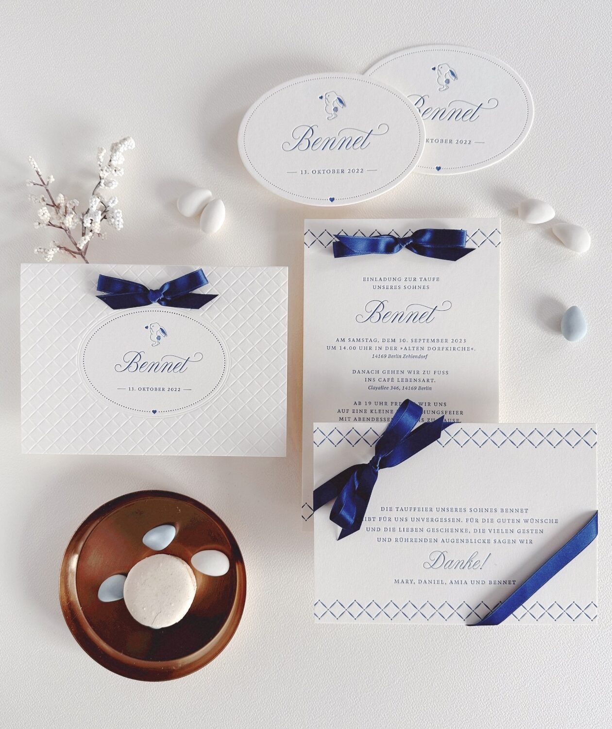 Es ist stets eine besondere Ehre, liebevolle Geburtskarten, Letterpress Taufeinladungen, Menükarten und Dankeskarten für Neugeborene zu gestalten. Vor allem wenn sie von einer Familie in Auftrag gegeben wird, die wir sehr schätzen und schon länger begleiten. Wir hatten bereits das Privileg, entzückende Letterpress-Babykarten mit einem süßen Storch für die Geburt der Tochter zu fertigen. Und nun präsentieren wir diese faltbaren, haptischen Klappkarten mit einer süßen Schleife in »Königsblau« und einem dezenten Karomuster verziert. Das beliebte Ornament kommt durch den Letterpress-Druck wunderschön zur Geltung und erzeugt ein fesselndes Spiel aus Licht und Schatten.