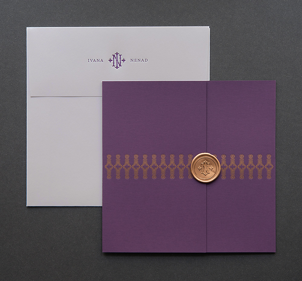 Das Besondere an dieser eleganten Hochzeitseinladung ist das außergewöhnlich große Format von 20 x 20 cm. Verschlossen mit einem goldenen Wachssiegel wurde die Einladung in eigens dafür angefertigten Umschlägen an die Gäste versendet.