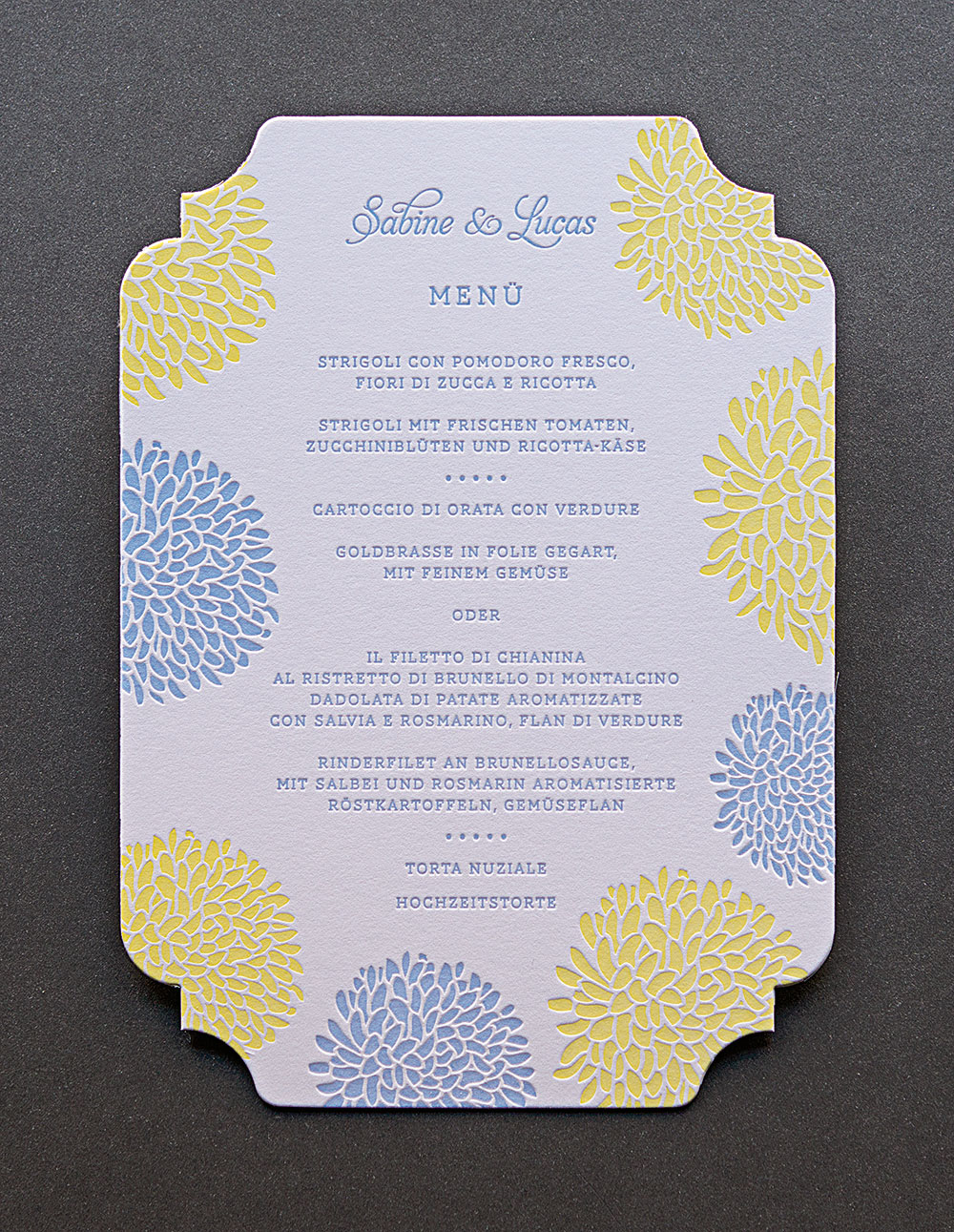 Für die Hochzeit von Sabine & Lucas in der wunderschönen Toscana haben wir diese Hochzeitseinladungen gestaltet. »Pompons« dienten nicht nur als Ornament auf den Letterpress-Karten, sondern wurden auch als Deko-Element verwendet. Ergänzt wurden die Einladungen durch Menükarten, Namenskärtchen als Glasanhänger sowie ein Gästebuch.
