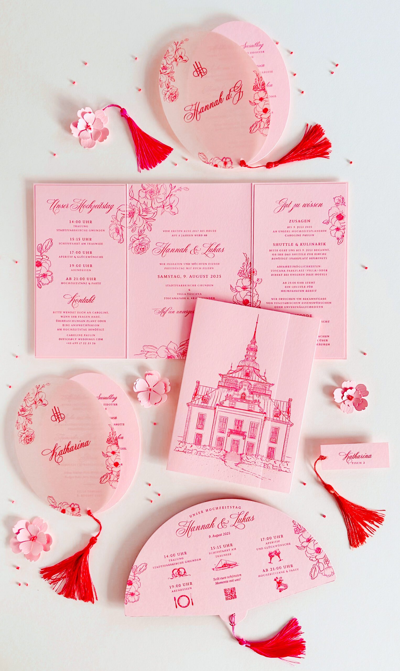 Diese außergewöhnlichen Hochzeitseinladungen im Doppel-Klappkarten-Format vereinen Eleganz, Raffinesse und modernes Design auf eindrucksvolle Weise. In einem zarten Roséton gedruckt und mit floralen Illustrationen sowie feinen typografischen Details veredelt, schaffen sie einen ersten, unvergesslichen Eindruck der Feier. Beim Aufklappen entfaltet sich das komplette Hochzeitsprogramm – stilvoll präsentiert und perfekt strukturiert, sodass die Gäste alle wichtigen Informationen auf einen Blick erhalten. Das liebevoll illustrierte Motiv der Hochzeitslocation bildet dabei den zentralen Blickfang und verleiht der Papeterie eine persönliche, künstlerische Note.