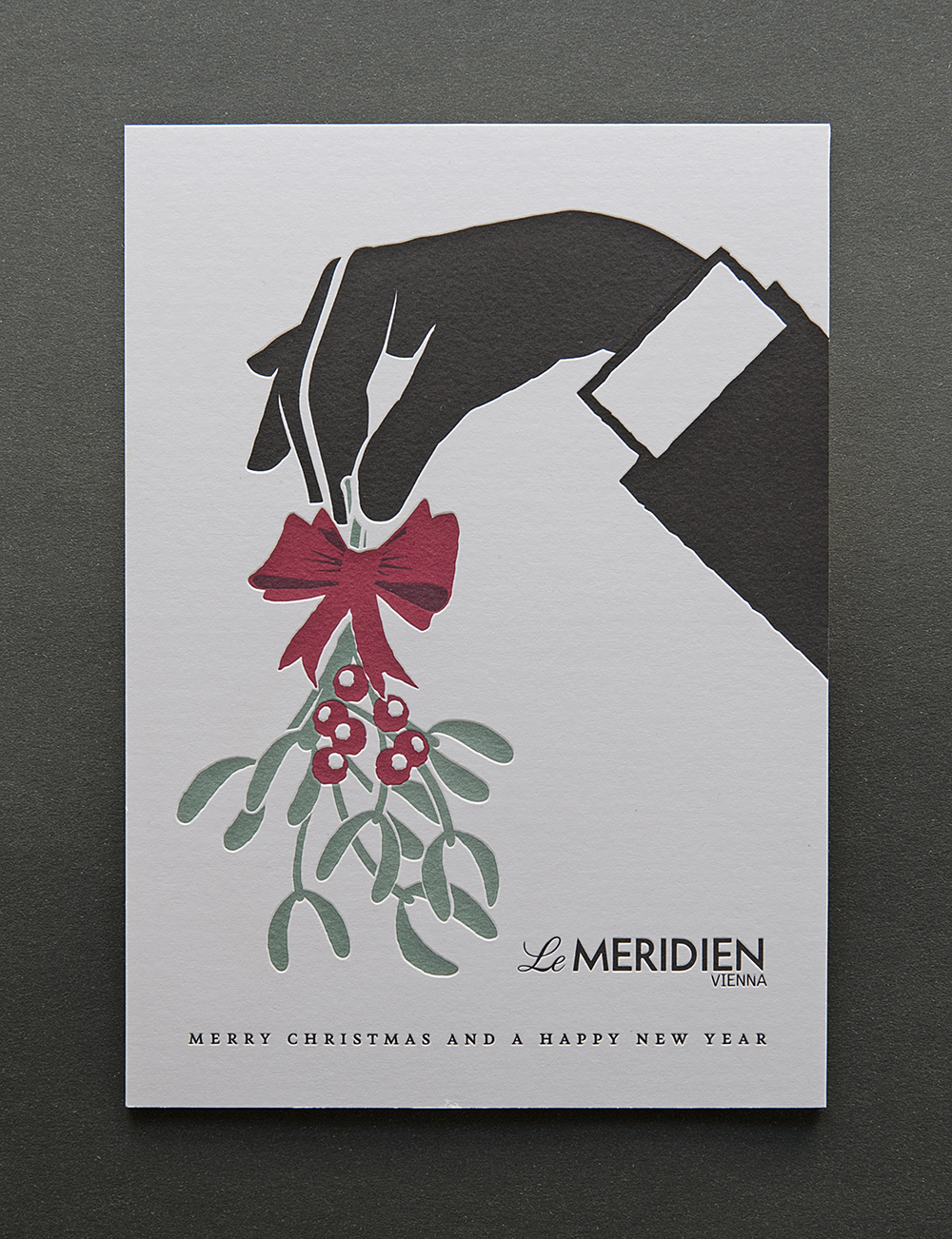 Mistelzweige sind nach wie vor eines der schönsten Weihnachtssymbole auf den saisonalen Grußkarten – ein Klassiker, der nie aus der Mode kommt. Ob modern oder klassisch-elegant interpretiert, sie bringen immer eine festliche, leicht verspielte Note mit sich. Für diese moderne Weihnachtskarte mit Mistelzweig stand ein ganz besonderes Wiener Hotel Pate. Die Idee: eine elegante Hand-Geste in schlichtem Schwarz-Weiß, kombiniert mit festlichen Druckfarben in Rot und Grün.