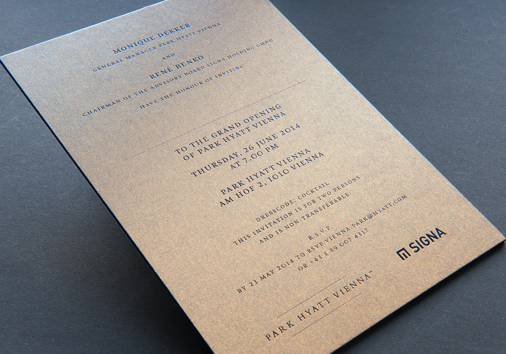 Für das »Grand Opening« des neuen Park Hyatt Vienna im »Goldenen Quartier« in der Wiener Innenstadt durften wir diese exklusiven Einladungen gestalten und produzieren. Die 3 mm dicke Einladungskarte mit einer schwarzen und einer goldenen Seite wird in eine schwarze Versandhülle eingelegt und mit einem goldenen Wachssiegel verschlossen. Beide Seiten der Karte bestehen aus exklusiven Materialien der Büttenpapierfabrik GMUND mit leichtem »Schimmer« und einer sehr feinen Micro-Prägung. Die Fassadenansicht des Hotels wurde in Goldfolie, die Textseite mit schwarzer Metallic-Folie geprägt.