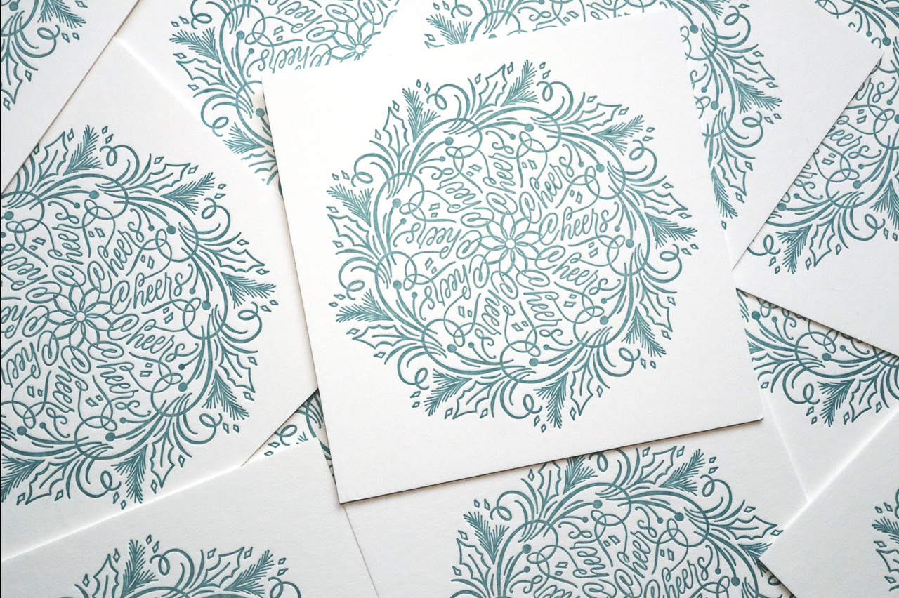 Diese fesche, stimmungsvolle Weihnachtskarte ist ein in unserem Atelier gefertigter Letterpress-Druck auf 600 g feinstem Baumwollpapier. Diese Karten schmeicheln der Hand und dem Auge. „Cheers“ ist neutral genug für Weihnachten, Silvester oder sonstige Feiern, die in diese Saison fallen. Das wunderschöne Eisblau wirkt frisch, winterlich und angenehm. Entworfen mit der Feder, digitalisiert am iPad und gedruckt in Wien.